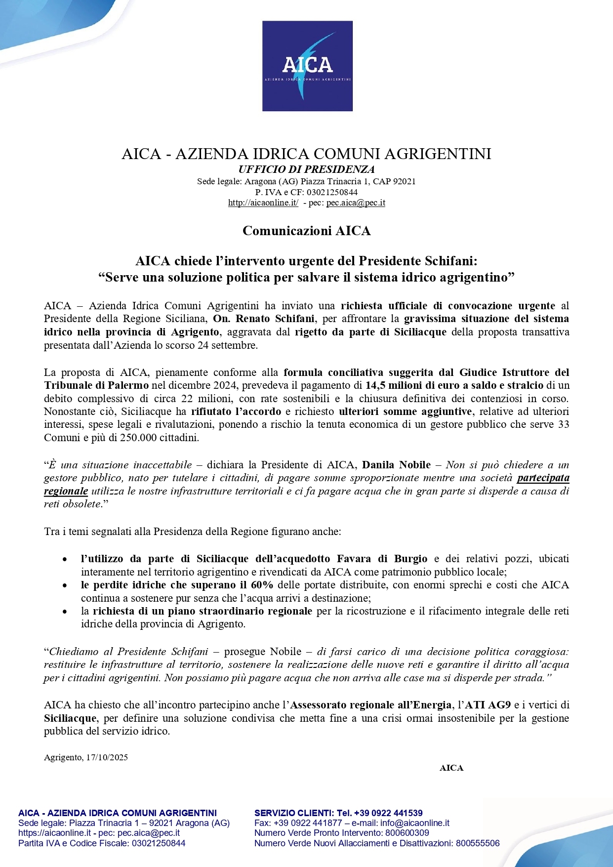 L'AICA (Azienda Idrica Comuni Agrigentini) ha inviato ieri, venerdì