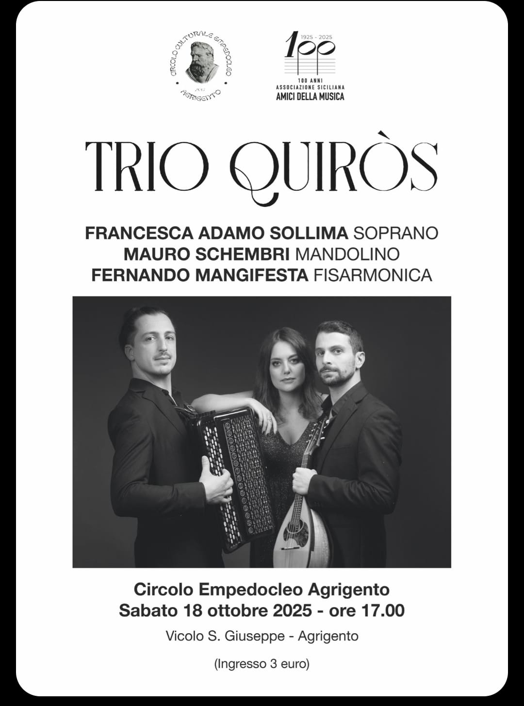 Il "Trio Quiròs" in concerto; aggi al Circolo Empedocleo di Agrigento