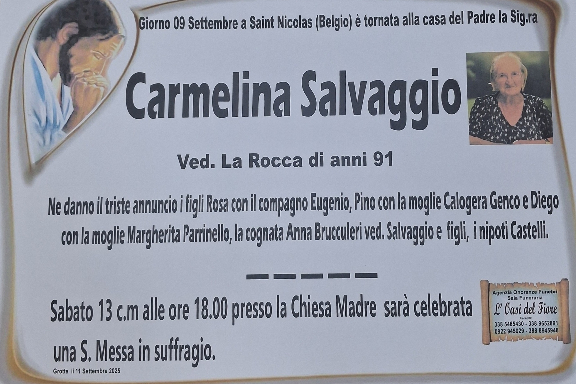 Carmelina Salvaggio; sabato Messa in suffragio