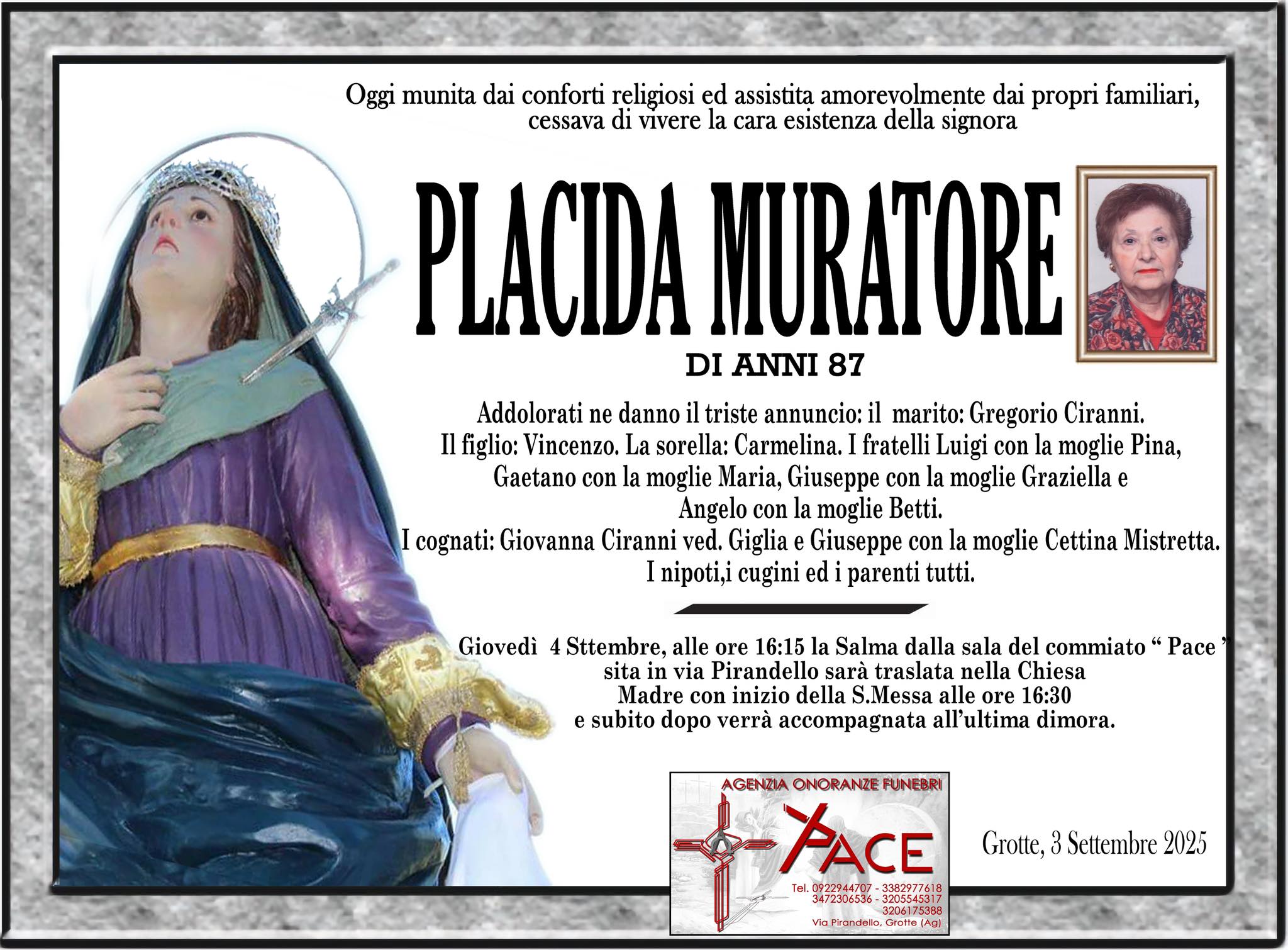 Placida Muratore; domani le esequie