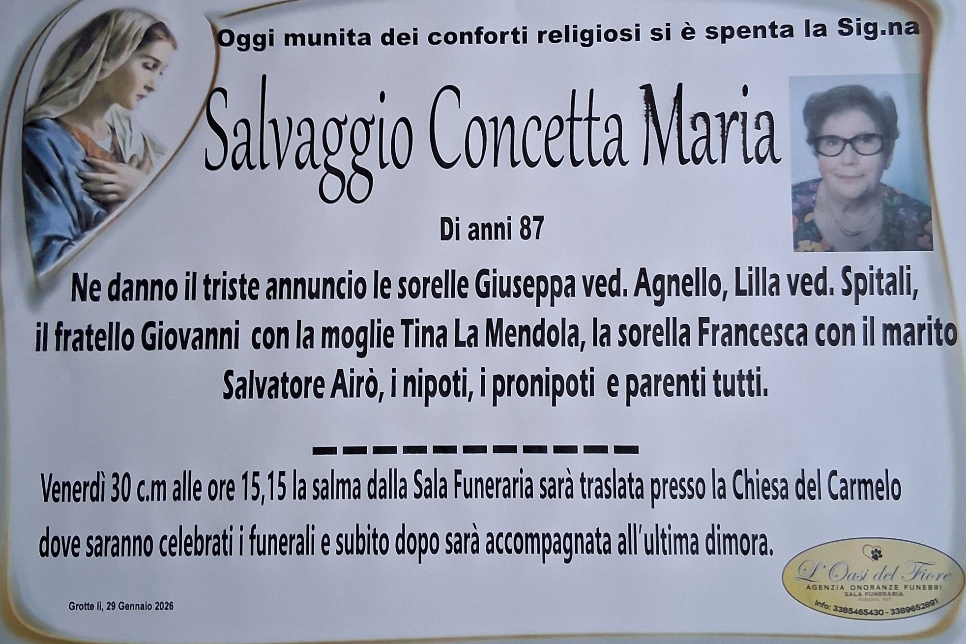 sig.na Concetta Maria Salvaggio; domani le esequie