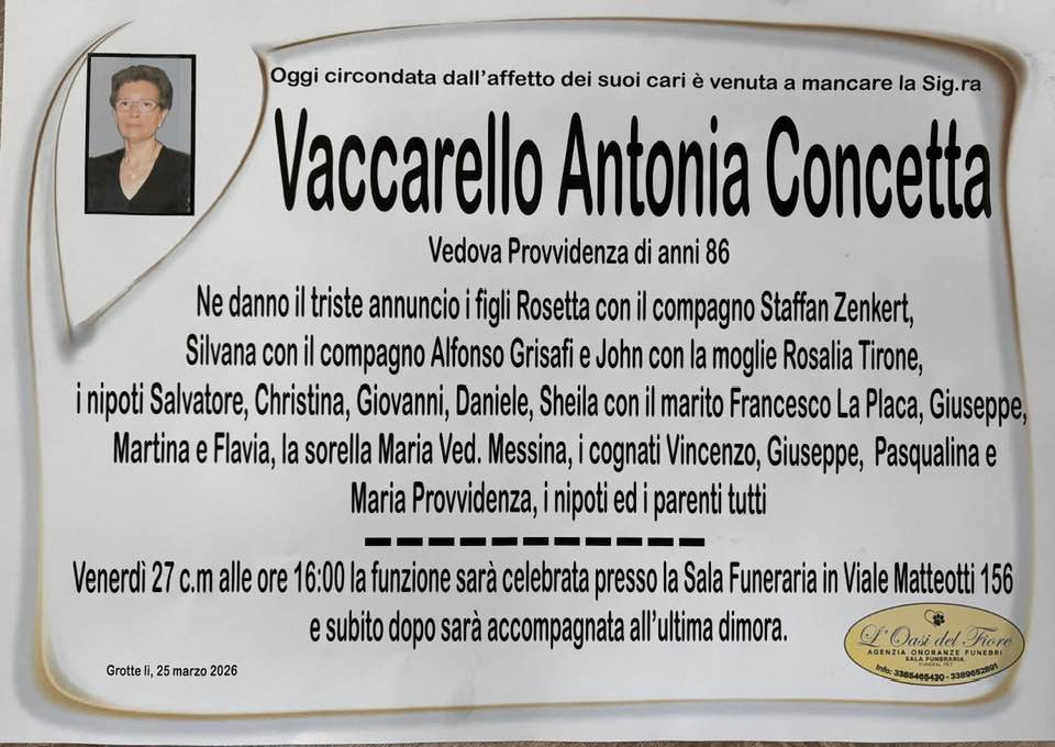 È venuta a mancare la sig.ra Antonia Concetta Vaccarello;