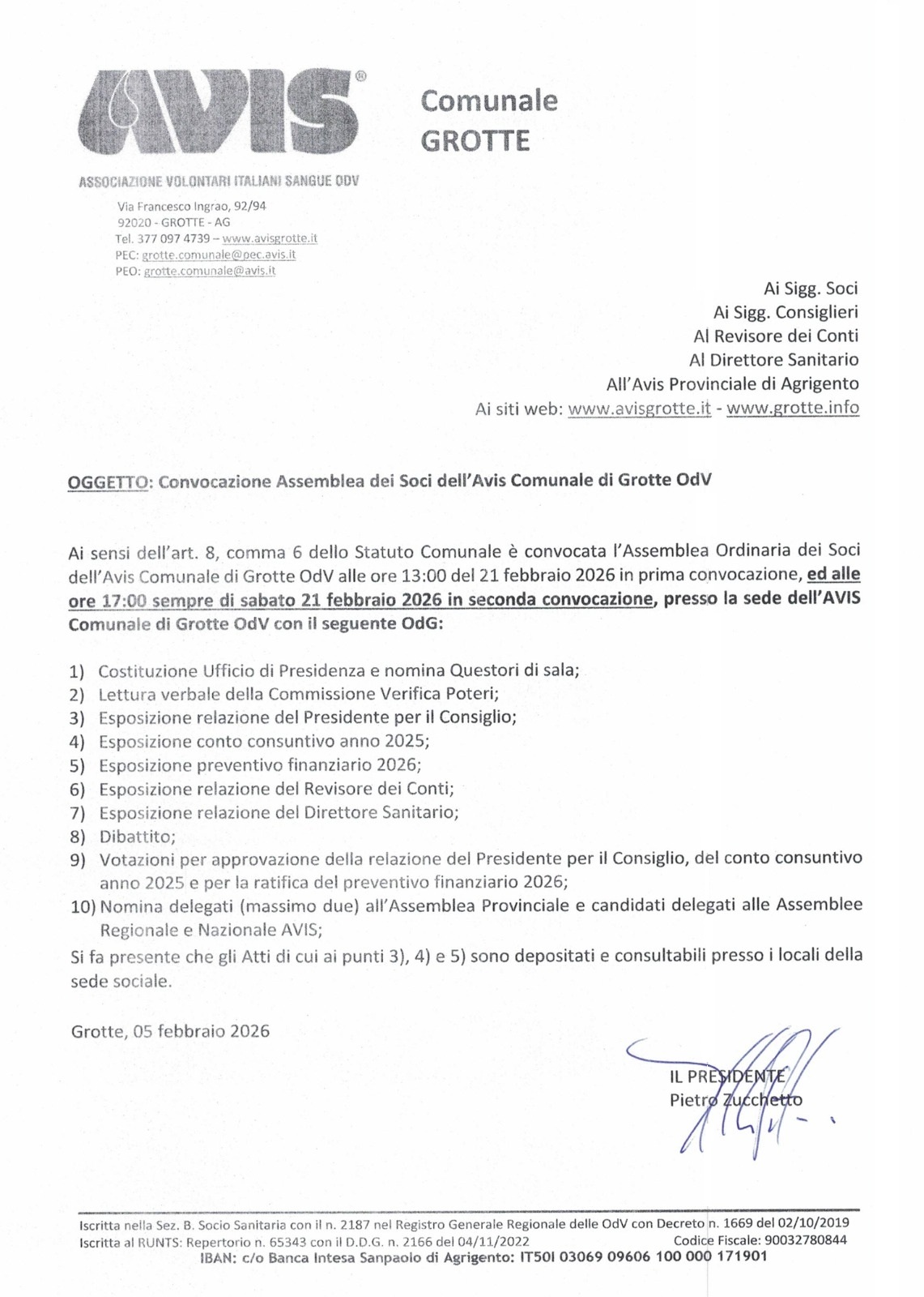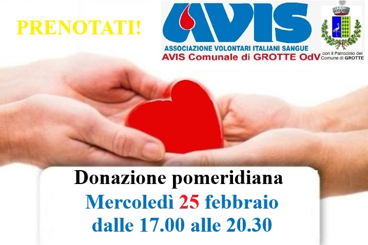 Avis comunale di Grotte: donazione straordinaria pomeridiana mercoledì